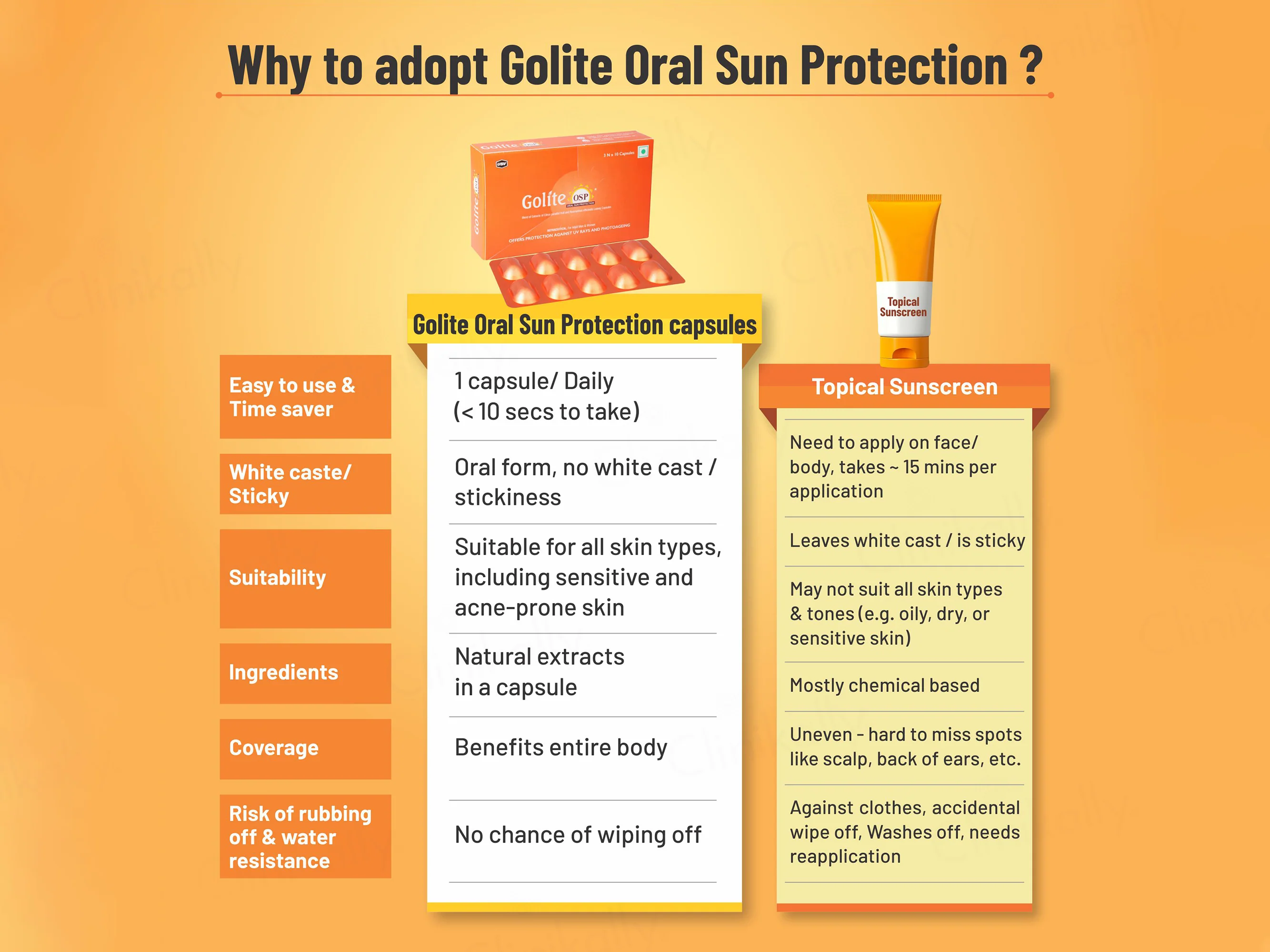 Golite OSP Capsule is an advanced oral sun protection supplement designed to support skin health from within. Powered by Mediterranean grapefruit and rosemary extracts rich in polyphenols and flavonoids, it helps protect against UV rays, sun damage, redness, and photoaging. This once-daily capsule works to reduce wrinkles and fine lines while promoting a healthy, natural skin glow. Suitable for all skin types, including sensitive and acne-prone skin, Golite OSP offers antioxidant-rich, full-body sun defense with no white cast, stickiness, or risk of rubbing off.