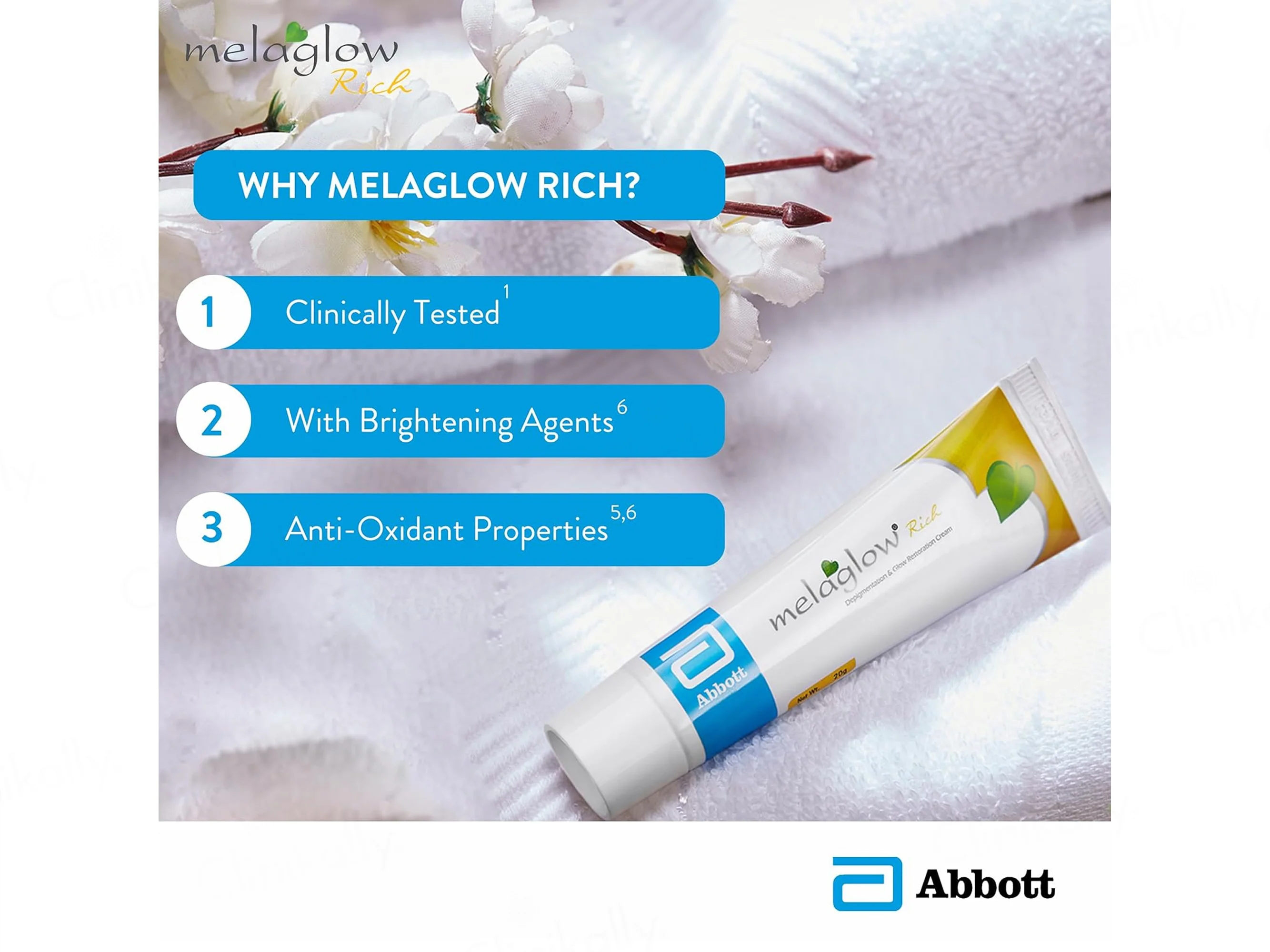 Melaglow Rich Depigmentation & Glow Restoration Cream is a targeted skin-brightening formulation designed to help reduce hyperpigmentation, improve uneven skin tone, and restore natural glow while providing nourishing skin comfort with regular use. Melaglow Rich Depigmentation & Glow Restoration Cream works through a combination of proven depigmenting agents and skin-renewing actives that help regulate melanin production and enhance radiance, and as shown in the images, it contains key ingredients such as Licorice Extract to soothe and brighten the skin, PteroWhite to support reduction of dark spots, Arbutin and Kojic Acid Dipalmitate to help control pigmentation, Niacinamide to improve skin tone and texture, Soy Isoflavones to support skin vitality, and Glycolic Acid to promote gentle exfoliation and glow restoration.