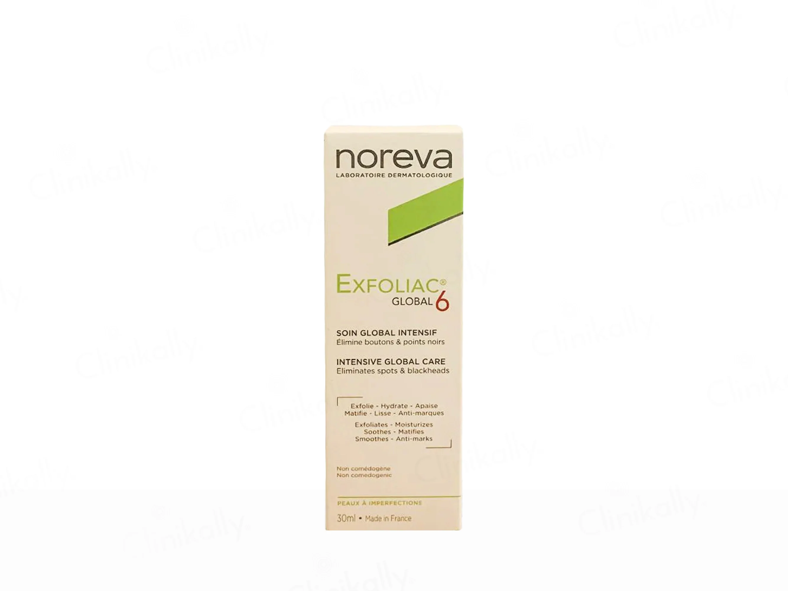 Noreva Exfoliac Global 6 Intensive Care is an intensive global treatment designed to eliminate spots and blackheads while exfoliating, hydrating, soothing, mattifying, and smoothing blemish-prone skin. Formulated with Glycolic Acid and Lactic Acid for effective exfoliation, Papain for enzymatic resurfacing, and Potassium Azeloyl Diglycinate to help reduce imperfections and regulate sebum, it also contains Niacinamide to improve skin clarity and tone. Imperata Cylindrica Root Extract and Saccharide Isomerate provide lasting hydration, while Oenothera Biennis (Evening Primrose) Oil and Tocopherol offer soothing and antioxidant support. Punica Granatum Pericarp Extract further enhances the formula with protective benefits, making this non-comedogenic care ideal for skin with imperfections seeking smoother, clearer, and more balanced results.